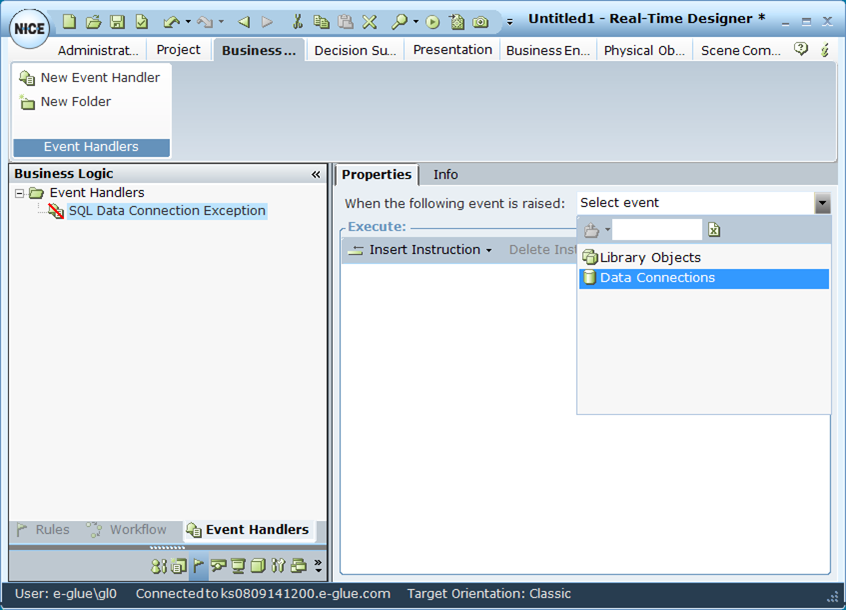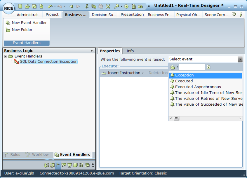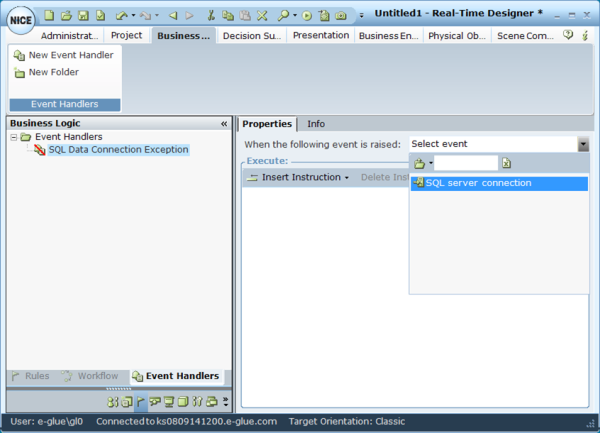The event handler informs you whenever a database action fails. Based on the message you receive, you can then use that logic in your project, as it is held as part of a business entity property. For example, in the window below, ExecuteNonQuery Error (highlighted in dark blue) is the type of database action that generated the exception.