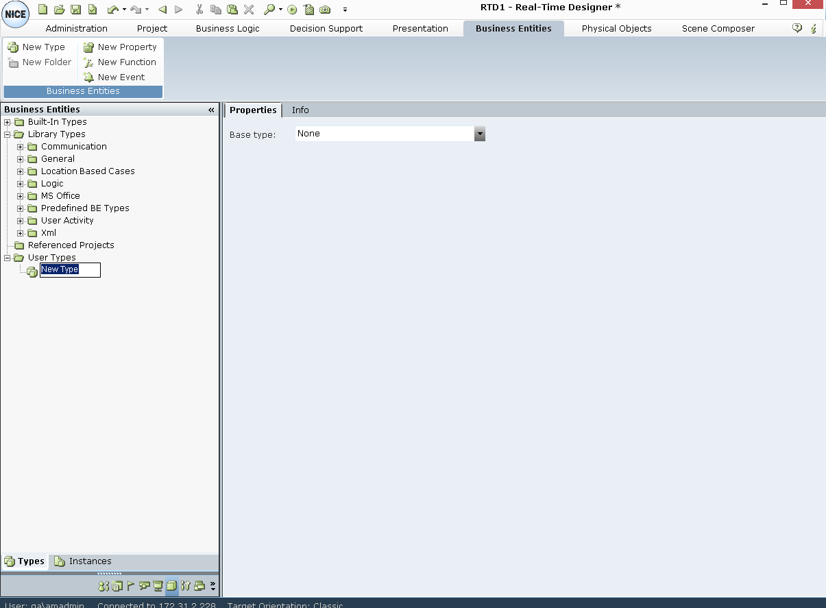 3. A Base type specifies a previously defined business entity on which the current business entity is to be based. In the Properties tab, select a Base type from the drop-down list.