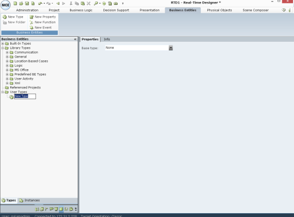 A business entity is created by first creating the business entity, and then defining its properties, as described in Defining a User Type Property, or by basing it on another business entity type.