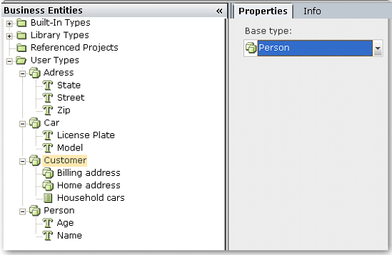 An example of a base type is a new business entity user type called Customer, which is based on a previously defined business entity user type called Person. Person might have two properties: Age and Name.
