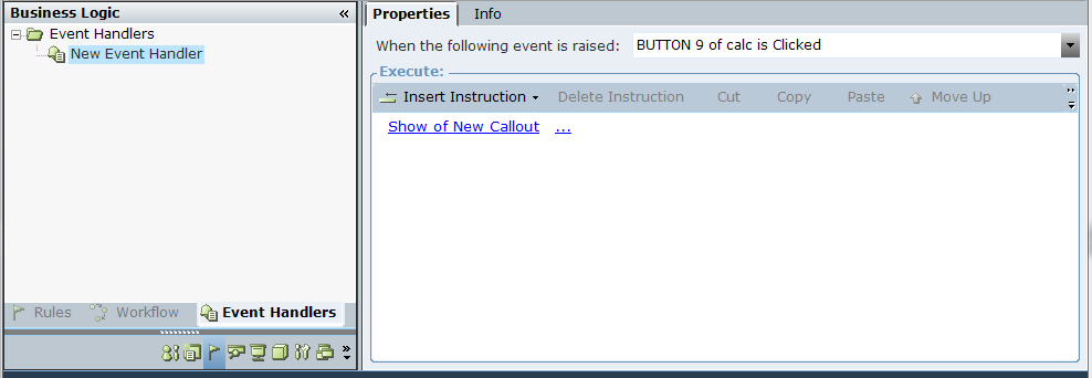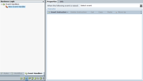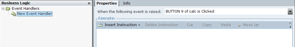 In Real-Time Designer, click the Business Logic tab and then click the Event Handler tab in the center on the left of the window to display the Event Handlers definition window. |