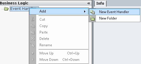 Right-click the Event Handler root of the tree, select Add and then select New Event Handler: |