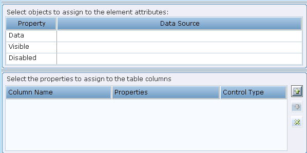 : Assignment (Binding): Displays a window in which you can specify the properties of a business entity to be assigned to the visibility, disabled or value/items attribute of an HTML element. Refer to Controls Tool for a few examples of using this tool.
