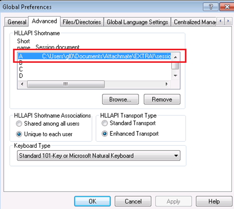 | 3. | In the HLLAPI Shortname section, click the A in the list box, and define the path to the open session. |