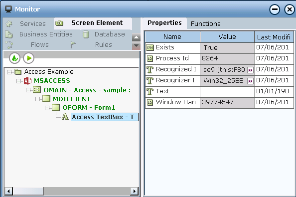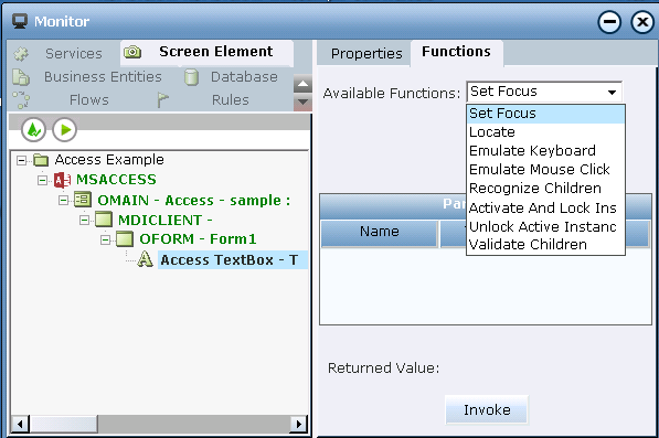 Monitor shows only functions of simple returns (Boolean, DateTime, Decimal, Number, Text; see Using Win32 Office Screen Elements During Runtime for details). To view properties of other types (List type, Screen Element Rectangle type, and other business entities), you must bind them to business entities in the project.