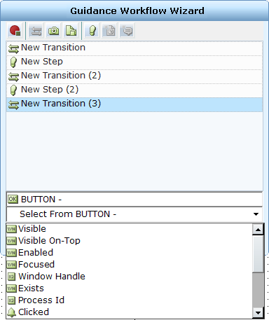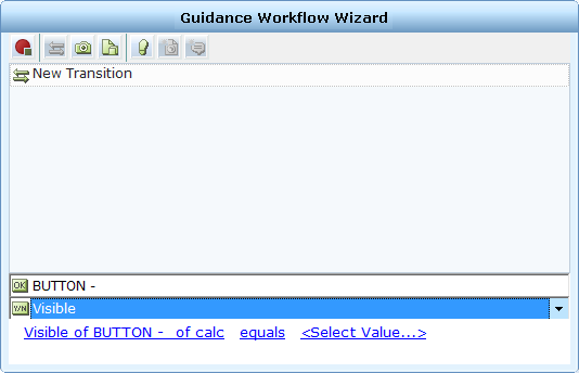 | 4. | Define the property or event to connect to the captured screen element, which will be used for the transition. To do so, select the property or event to assign to the screen element from the drop-downlist . This drop-down lists all the properties and events that are relevant to the screen element specified in the edit box. For example, in the window below, the Visible property is selected for the BUTTON - screen element. |