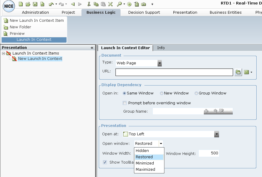 | 7. | In the Display Dependency area, specify in which window the document is displayed. This feature enables you to control and restrict the windows that are opened by Real-Time Designer on an agent's desktop: |