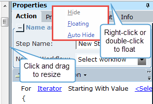 Properties pane: Enables you to view and define properties for the selected element in the workflow, as well as insert instructions. You can expand the width of the pane to see additional tabs. You can also right-click the title bar and select Floating to move the pane on the screen or to another screen.