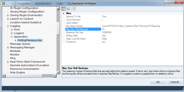 Max Size Roll Backups: The maximum number of log files. The default setting is 10.