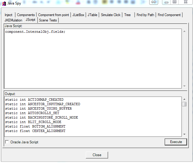 component.InternalObj.getInnerBrowserPanel("java.lang.Object","",false).InternalObj.evaluate("java.lang.Object","java.lang.String",false,"alert('test')");