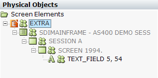 | 3. | In the Real-Time Designer, select the Physical Objects tab. The Screen Elements tree includes two levels of screen elements - the process at root level, and the HLLAPI screen element that was captured. |