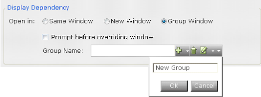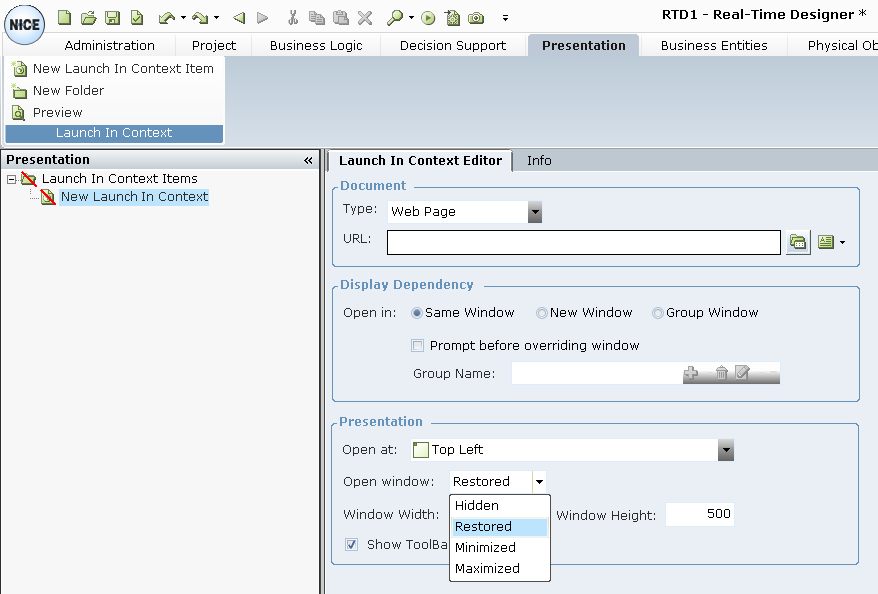| 6. | In the Display Dependency area, specify in which window the document is opened. This feature enables you to control and restrict the windows that are opened by Real-Time Designer on an agent's desktop, as follows: |