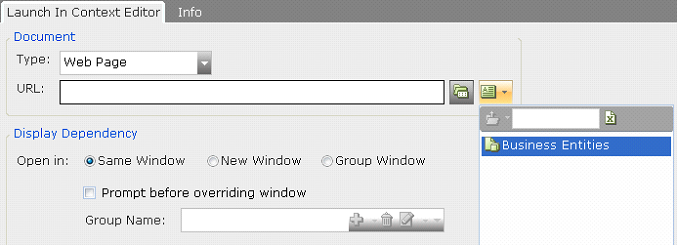 You can define dynamic URL addresses or file names in this field by including the names of business entity properties. To do so, click the