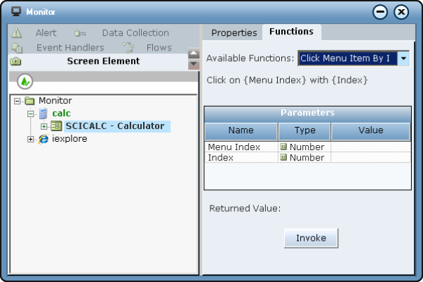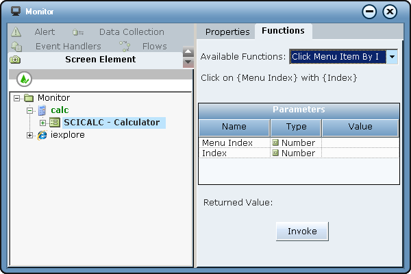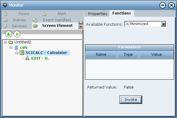 To use the Functions tab, first select a function in the Available Functions drop-down list. The parameters for that function are then shown in the window. Then, set the value(s) for the function and click Invoke to test the function using the values you specified.