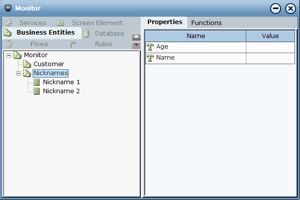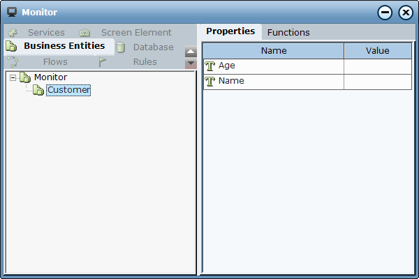 For example, if you select the Business Entities tab, a tree of business entities is displayed in the Navigation pane. Select an item in the tree to display its current property values in the Properties tab in the right pane. You can then modify property values by typing over them or by selecting from a drop-down list, depending on the type of property. In the exampple below, the Customer business entity has two properties: Age and Name.