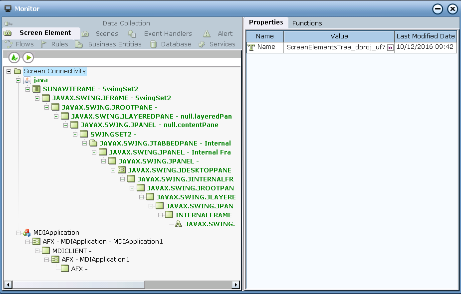 The Screen Elements tab in the Monitor window enables you to monitor Real-Time Designer screen elements. All screen elements, including hidden ones, are automatically shown in the Navigation pane of the Monitor window. Screen elements shown in green are alive; those that are not alive are not green.