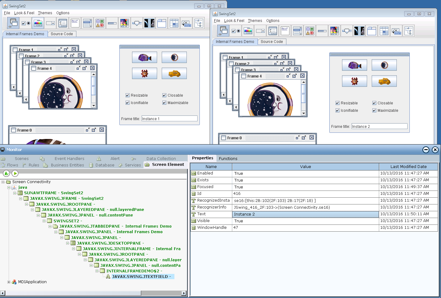 The Monitor window's Screen Elements tab is frequently used to verify connectivity, as the Monitor reacts when you perform a relevant action. For example, if you enter text in the Java application, you will also see this value in the Monitor window and which instance is active, as shown below: