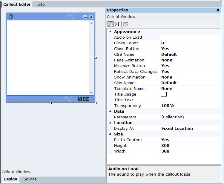 In the Callout Window and the callout BODY Property areas, you can set the frame size and appearance of a callout, such as show/hide effect, icon, title text, and skin name transparency.