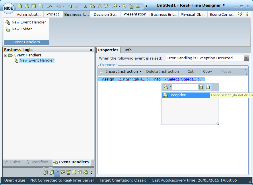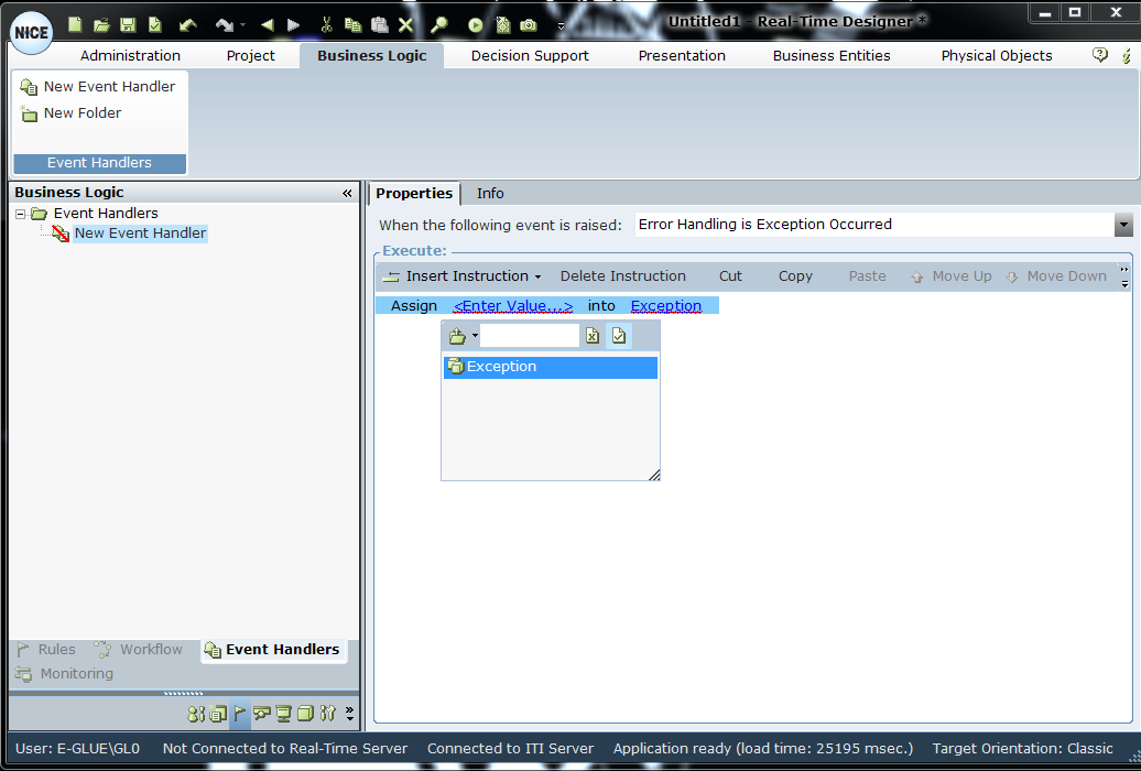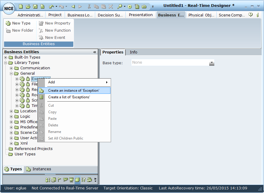 | b. | In the Business Entities tree, expand Library Type > General, then right-click Exception and select Create an instance of Exception. |