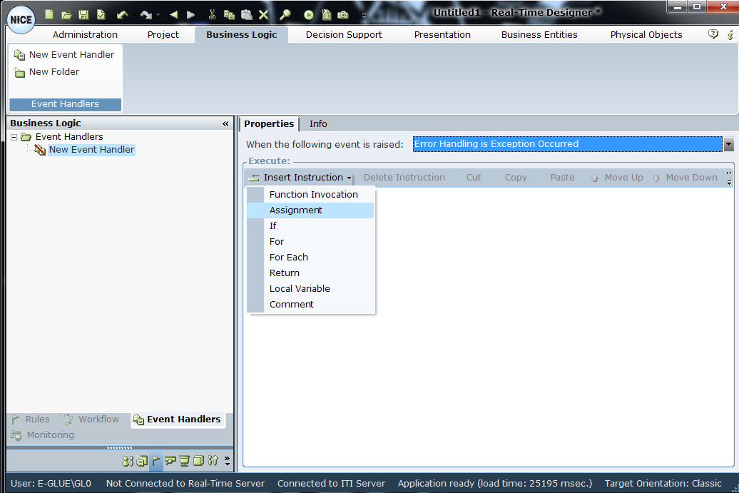 | 7. | Use the Assignment tool to select the business entity to hold the exception message, as shown in the series of windows below. From the Insert Instruction menu, select Assignment. |