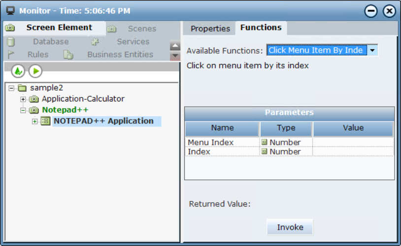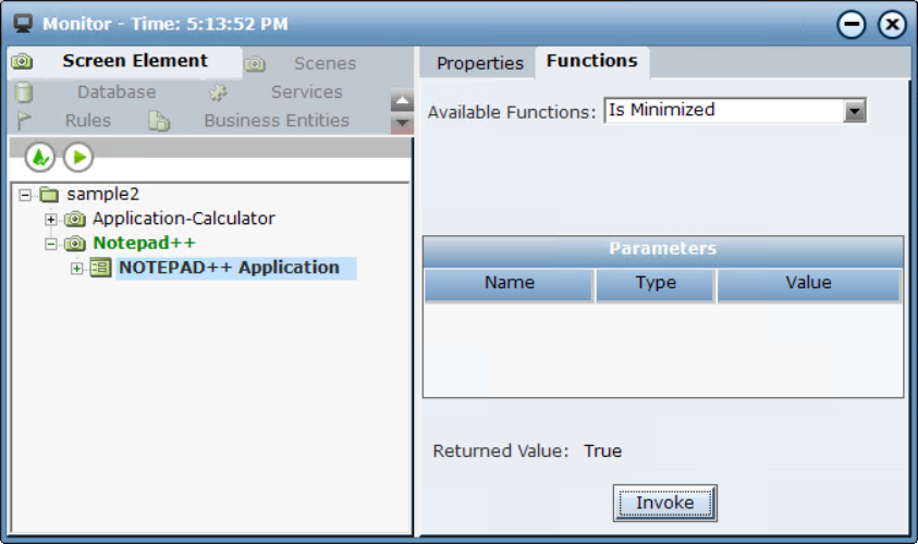 To use the Functions tab, first select a function in the Available Functions drop-down list. The parameters for that function are then shown in the window. Then, set the value(s) for the function and click Invoke to test the function using the values you specified.
