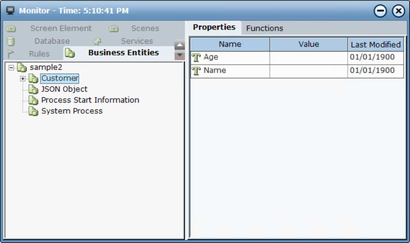 For example, if you select the Business Entities tab, a tree of business entities is displayed in the Navigation pane. Select an item in the tree to display its current property values in the Properties tab in the right pane. You can then modify property values by typing over them or by selecting from a drop-down list, depending on the type of property. In the example below, the Customer business entity has two properties: Age and Name.