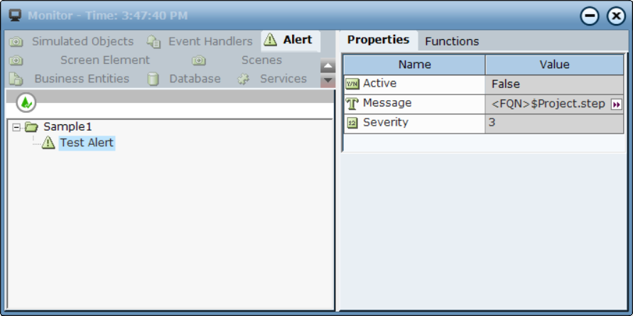 When you select an alert in the Navigation pane, the following properties are displayed: Active, Message and Severity. All properties are read-only.