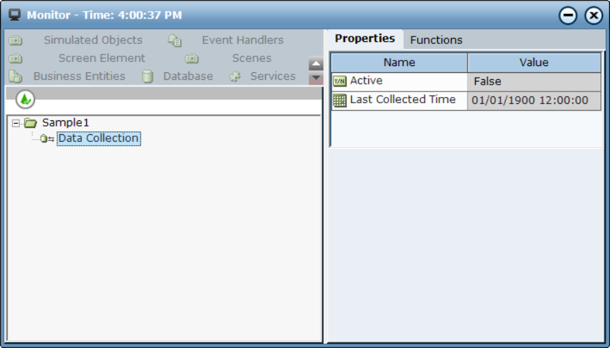 The Data Collection tab in the Monitor window enables you to monitor data collection objects and their properties: