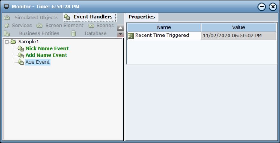 When you select an event handler in the Navigation pane, the Recent Time Triggered property is displayed for it in the Contents pane. This property is read-only.