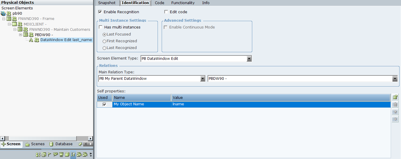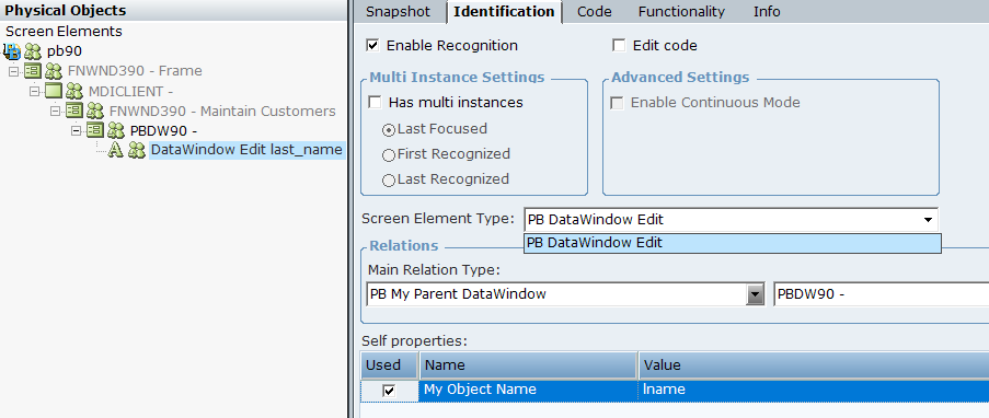 | 1. | Select a captured Power Builder DataWindow screen element in the Screen Elements tree and click the Identification tab. |