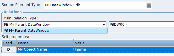 The available Main Relation Type for the PB DataWindow Button, PB DataWindow Edit, PB DataWindow Field, PB DataWindow Label, and PB DataWindow List screen element types is the BP My Parent DataWindow. This type indicates the screen element’s parent object, located one level above in the hierarchy.