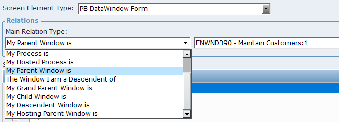 | 2. | Click the Main Relation Type drop-down list to show the available relations types for the Power Builder DataWindow screen element. The list of items in the Main Relation Type depends on the Power Builder DataWindow screen element type: |