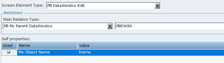 The screen element type is defined in the Screen Element Type drop-down list (in this case, PB DataWindow Edit).