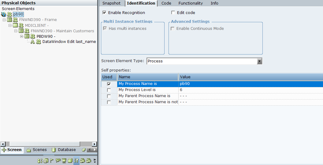 | 1. | Select the Process level of the captured PB DataWindow screen element in the Screen Elements tree and click the Identification tab. |