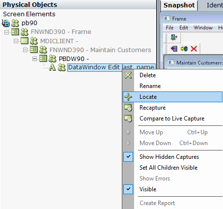 | 2. | To show a captured control in the Power Builder application’s window, right-click the screen element in Screen Elements tree and select Locate (see Locating Screen Elements for details): |