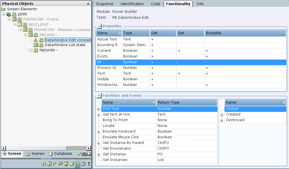 | 1. | Select the captured .NET screen element in the Screen Elements tree and click the Functionality tab. This tab shows the functionality of the selected screen element. For more information, see Understanding the Power Builder Screen Element Hierarchy. |