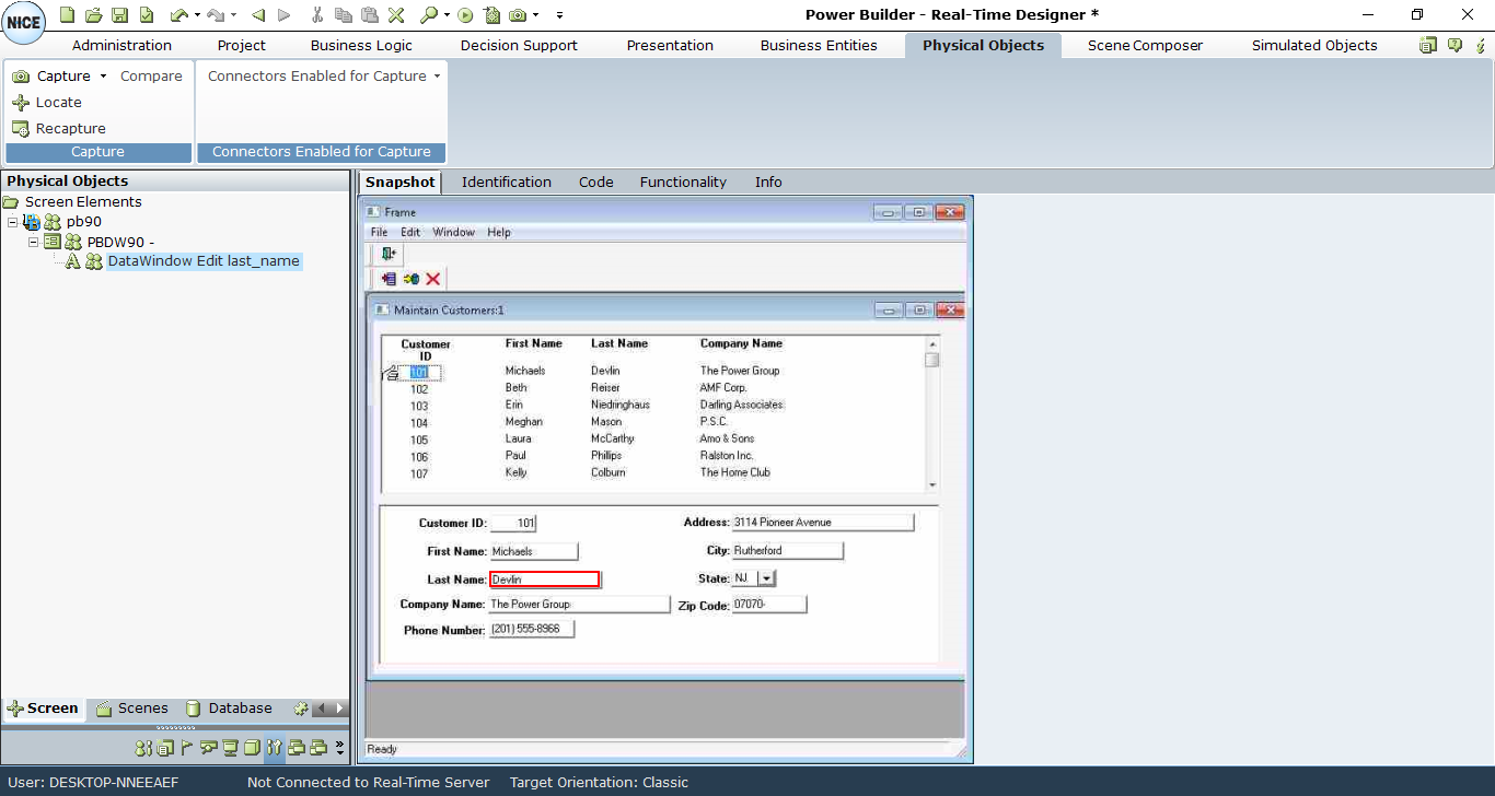 Real-Time Designer and Client provide the capabilities for locating screen elements that are captured in the Power Builder application.
