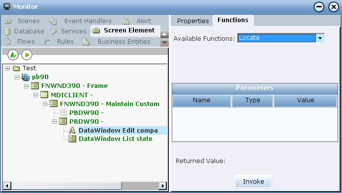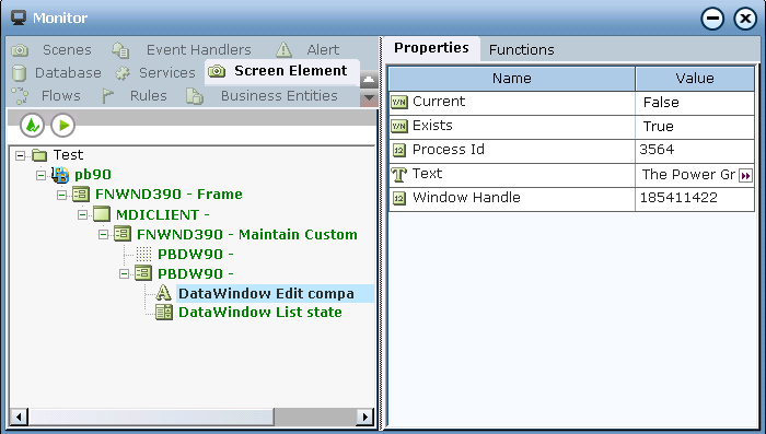 In the following example, the screen properties and functions of a Power Builder DataWindow Edit screen element are displayed in the Monitor window.