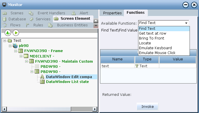 The Monitor window displays only functions of simple return types are shown. The functions of types such List, PO and CtrlPO are not shown. To use functions that are not shown, you need to define them in the Business Entities module (see Business Entitiesfor details).