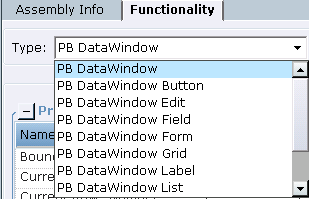 All Power Builder DataWindow screen elements types have their own properties, functions, and events. To view this functionality, navigate to the Functionality tab or locate it in the Project tab library in Real-Time Designer.