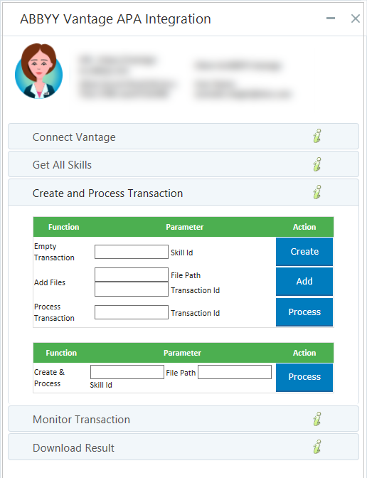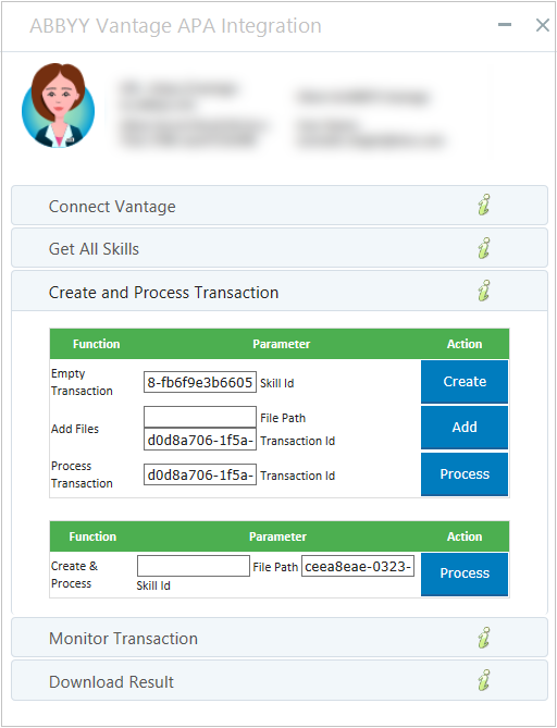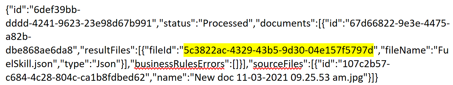 | 11. | To download the result, expand Download Result, copy in the File Id (the Transaction Id is automatically filled in) and click Download For details on the results, see ABBYY Vantage Library Objects. |