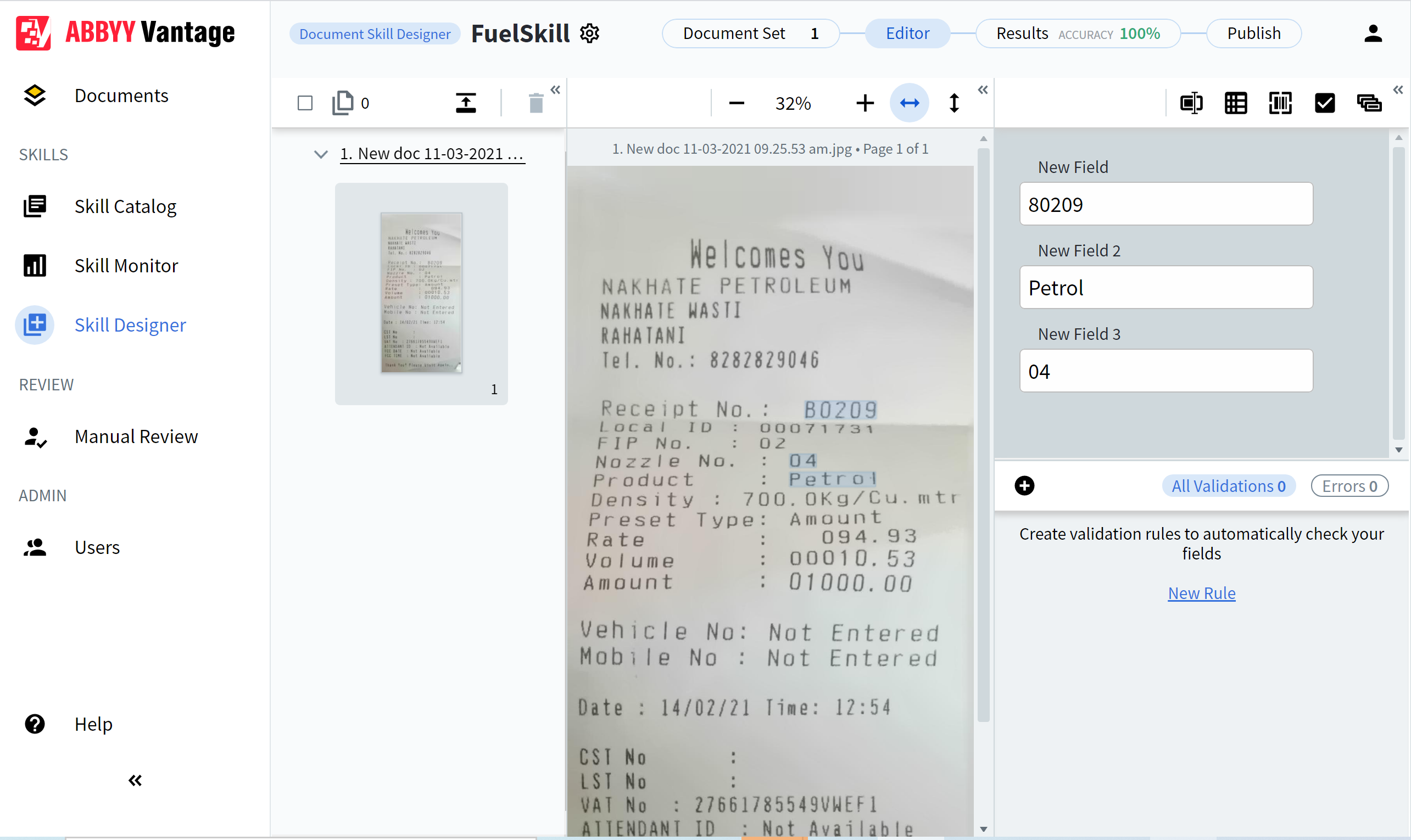In this sample scenario, APA sends fuel receipts to ABBYY Vantage, and use a pre-defined Fuel Skill to extract information from the receipt and return this to APA.