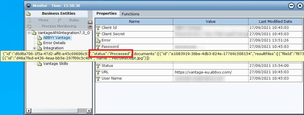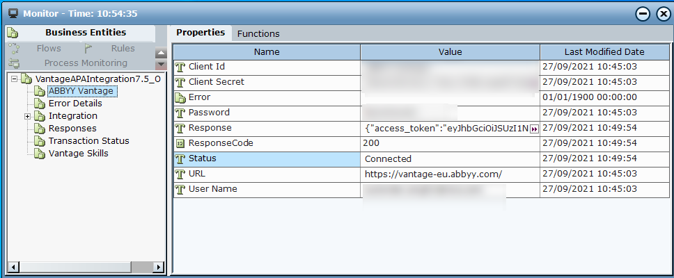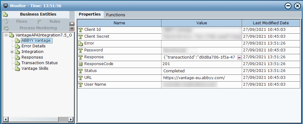 The Real-Time Designer ABBYY Vantage Sample project includes an instance of the ABBY Vantage Business Entity. This points to the ABBYY Vantage, which specifies the credentials, as well as the ABBYY Vantage Client Id and Client Secret.