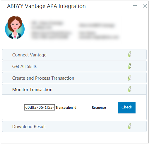 | 10. | To monitor the transaction processing, expand Monitor Transaction and click Check. The Response includes a "status":"Processed" once ABBY Vantage has finished processing the transaction. |
