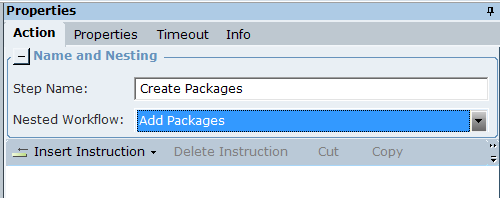 3. In the Action tab of the Properties pane, select the name of the workflow to be assigned to the step in the Nested Workflow drop-down list. When the workflow reaches this step, it runs the nested workflow like a sub-routine.