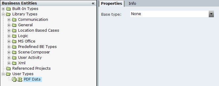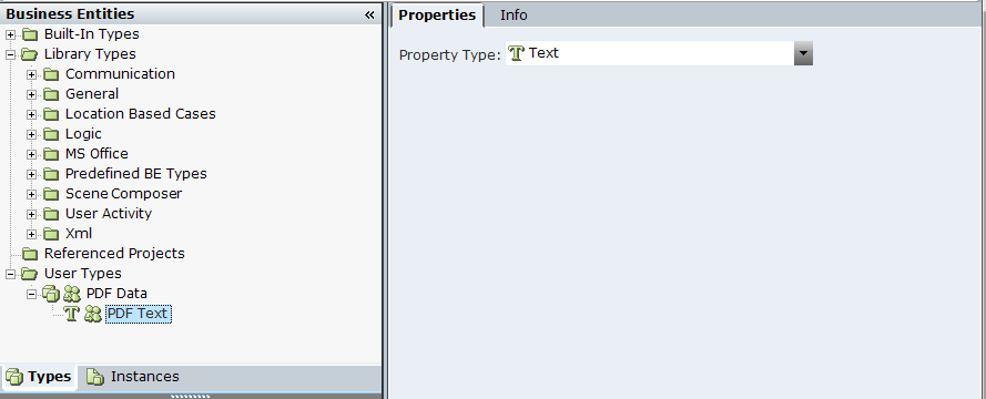 | 2. | Add a New Property of Text type to the PDF Data business entity type and assign the property a name, for example, PDF Text. In this example, the returned content of a PDF document is assigned to this business entity property: |