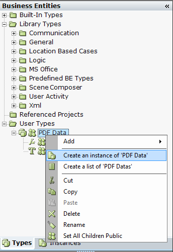 | 13. | Right-click the PDF Data business entity type in the Business Entities tree, and select the Create an instance of ‘PDF Data’ option: |