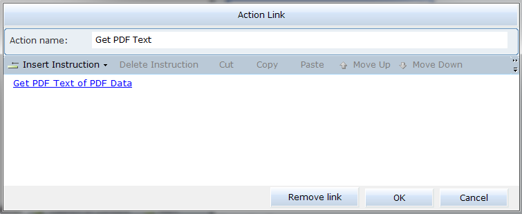 | 17. | Navigate to Business Entities > PDF Data > Get PDF Text In the Action Name field, give the action a name, for example, Get PDF Text and then click OK: |