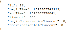 id: The conversation ID. beginTime: The start time of the conversation. endTime: The end time of the conversation. timeout: The invoker idle timeout. beginConversationTimeout: The Timeout (seconds) for conversation begin request message. conversationIdleTimeout: The Timeout (seconds) for idle conversation. See the Robotic Automation Solution Guide. |