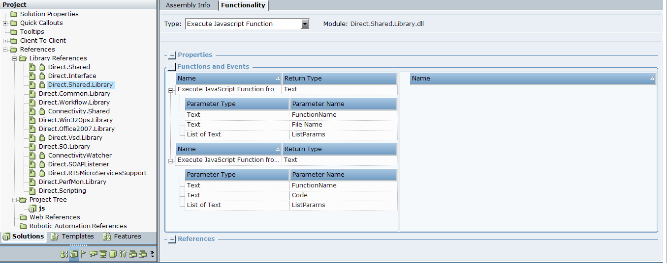 The functions are exposed under Project > References > Library References > Direct.Shared.Library > Execute JavaScript Function.